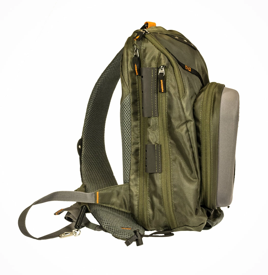 Our lightweight sling pack features strategically placed pockets and attachment points to carry a day’s worth of gear out of your way yet quickly accessible. Made with waterproof fabric and YKK zippers and includes a removable fly patch.