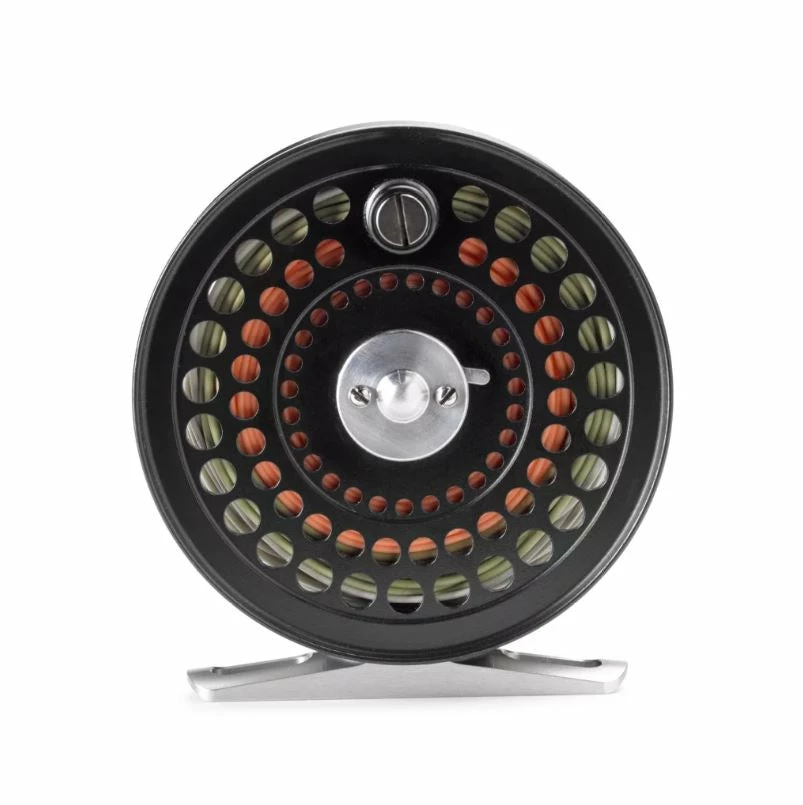 An updated version of the 1971 CFO click-and-pawl reel. Features a black frame and spool with silver accents. Reel case