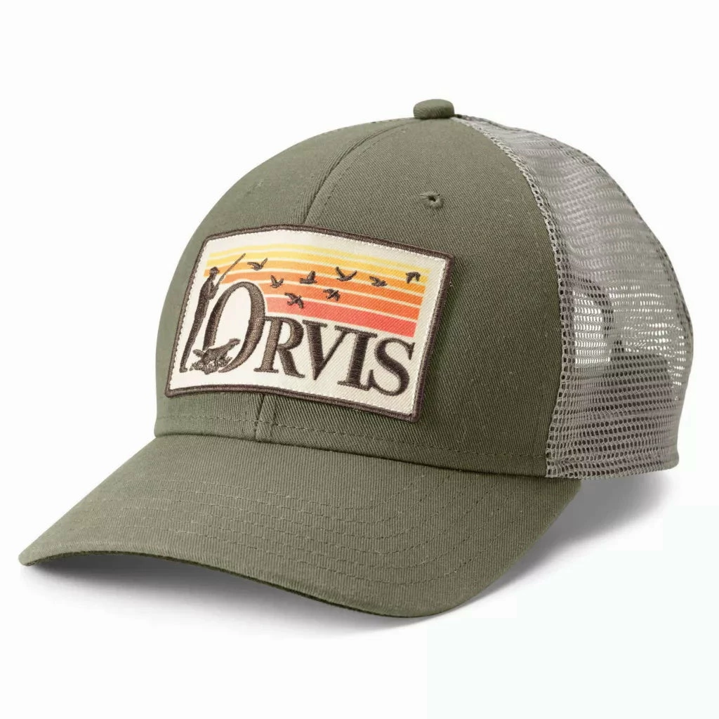 Keep cool with this mesh back structured trucker with Orvis bird hunting graphic logo